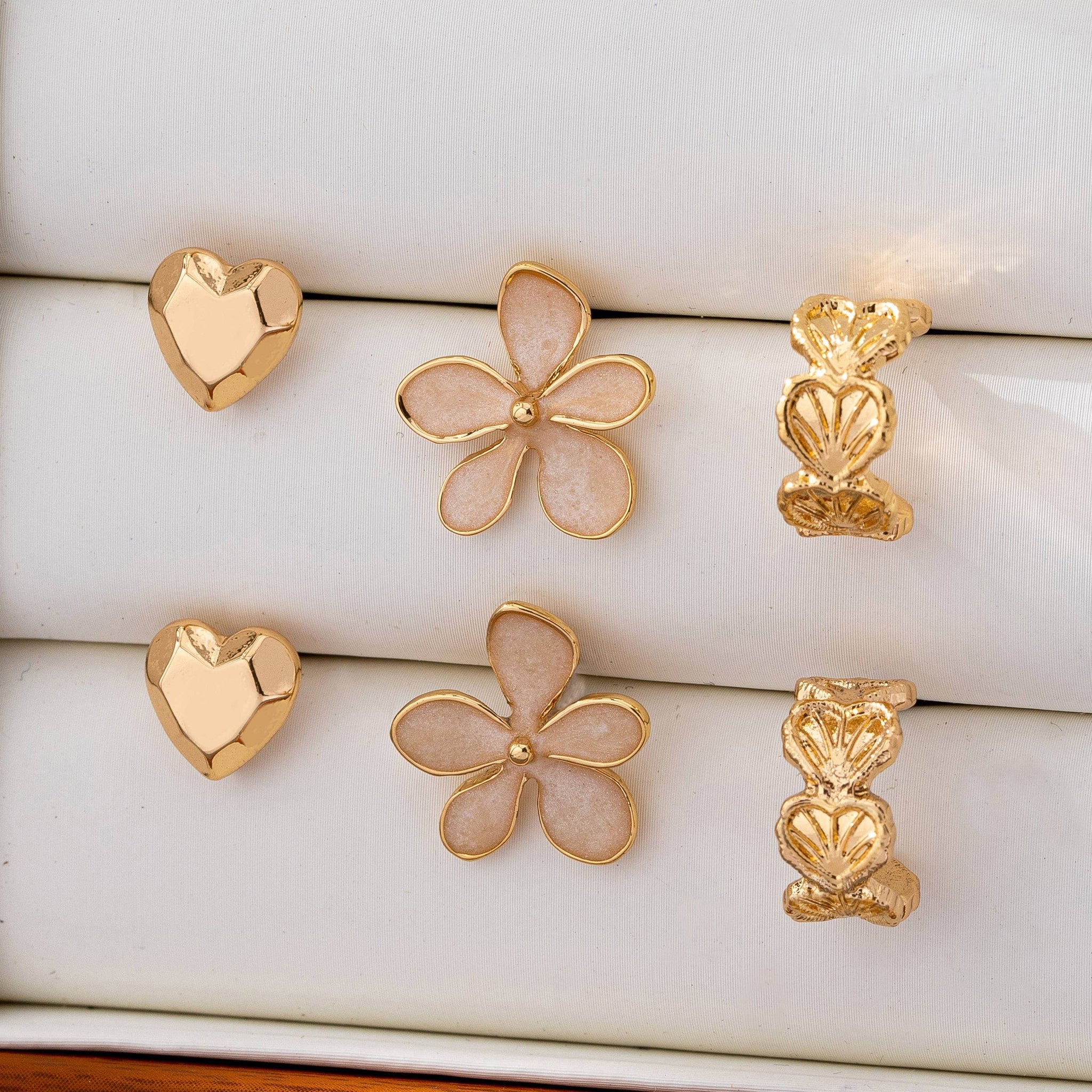 3-piece huggie hoop earring set, featuring dainty heart, flower and seashell hoops. Designed with a...