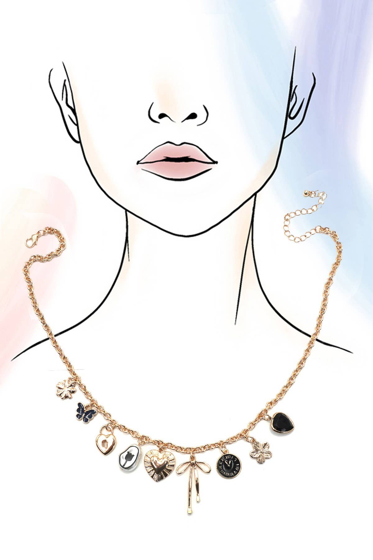 Charm Necklace-Heart, Clock, Bow & Lock Charms, featuring a charms including a puffed heart, vintage-inspired...