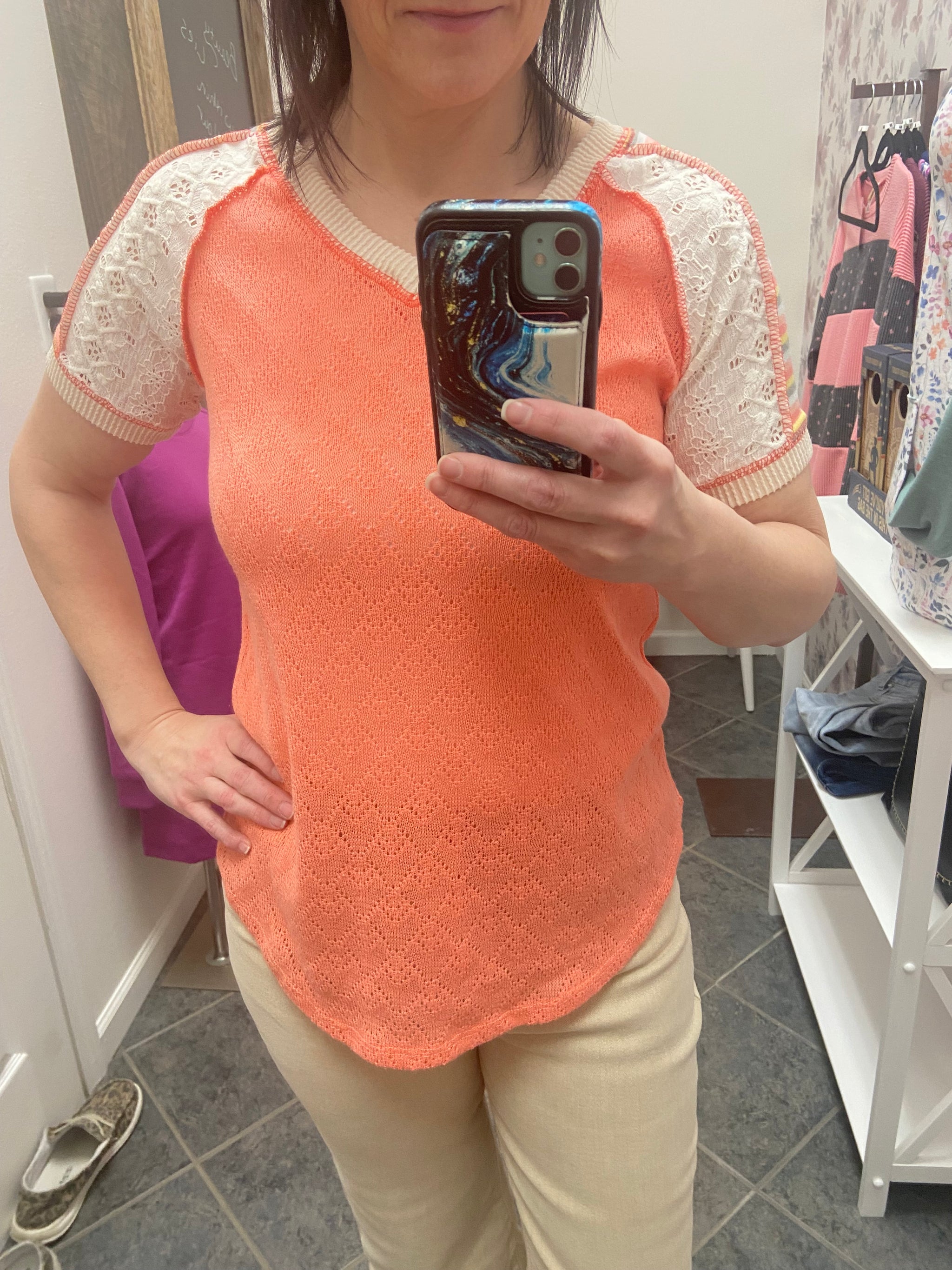 A DIAMOND LACE PATCHWORK DESIGN TOP FEATURING A V NECKLINE, EXPOSED STITCH, STRIPE CONTRAST, RIB,...