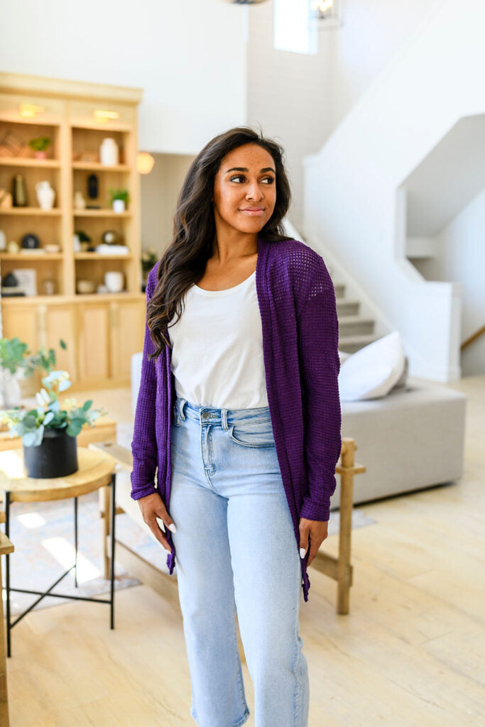 Cozy up in style with our Open Knit Cardigan in lavender. Made with an open...
